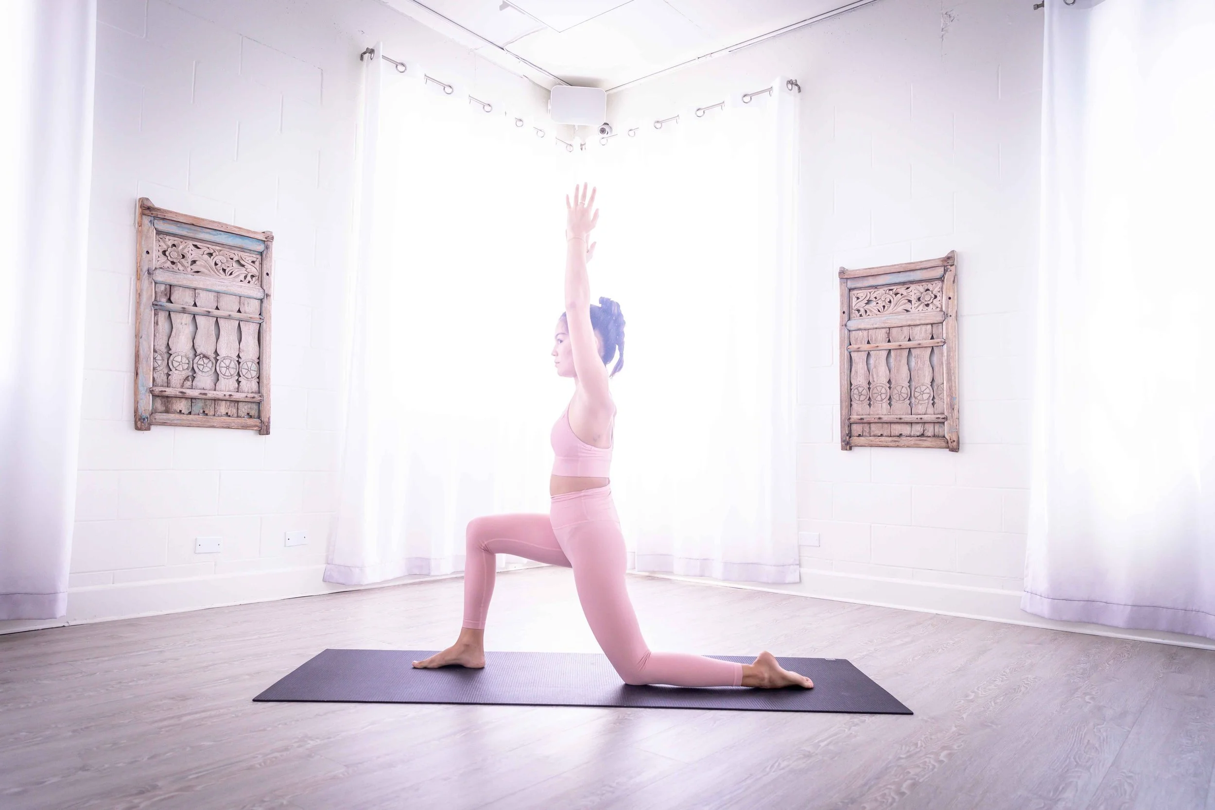 From low lunge, drop your back knee onto the ground and reach your arms overhead. Keep your front knee stacked over your ankle and gently pull your hips forward.